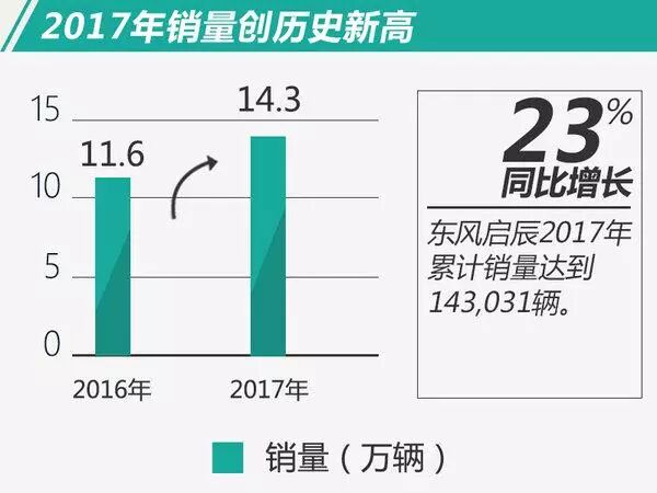 2017年,东风启辰实现终端销售143,031辆,同比增长22.7%,创造历史最高纪录,大幅跑赢市场大盘。值得一提的是,这也是东风启辰保持了连续十二个月的同比增长。
