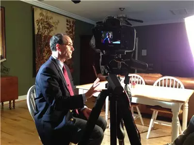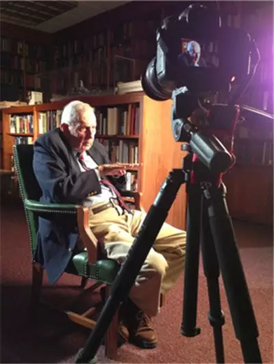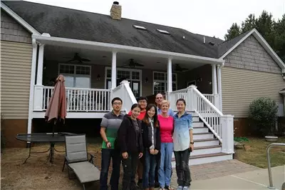 后来,在美国佐治亚州,我们见到了佐治亚大学历史系教授威廉·斯图克。威廉教授的采访对我们的帮助很大,在两个多小时的采访中,他尽可能详细的讲述了他所了解和研究的历史细节。不厌其烦的配合我们的拍摄,我们愉快地相处了一个下午。因为教授家里有一个巨大的游泳池,因此我们都叫他“游泳池教授”。告别时,大家决定拍一张合影留念。为了一个都不能少,迟总采用了高科技手段。请注意迟总的动作!