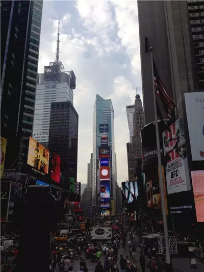 这两张照片今天依旧保存在我的手机相册中,现在看到它,依旧能想起当时初到纽约时的兴奋。这是我们工作的第一天。为了节省时间,一到达纽约,我们便开始了街景的拍摄,我们来到了纽约最具代表性的地段之一——曼哈顿。虽然小伙伴们拖着还没有调整过时差的身体和沉沉的眼皮,但眼前的一切已经完全掩盖了我们所有的疲倦,期间还不忘合影留念,记录下这美好的瞬间。