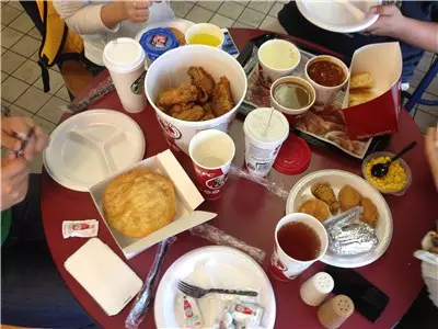 这是我们在弗吉尼亚州吃的一顿肯德基,请仔细看图,是不是和中国的肯德基有很大不同?美国的肯德基没有汉堡,只卖炸鸡,但酱料给的不是一般的足啊!现在想想还是很好吃的,但当时大家已经没什么心情品尝……