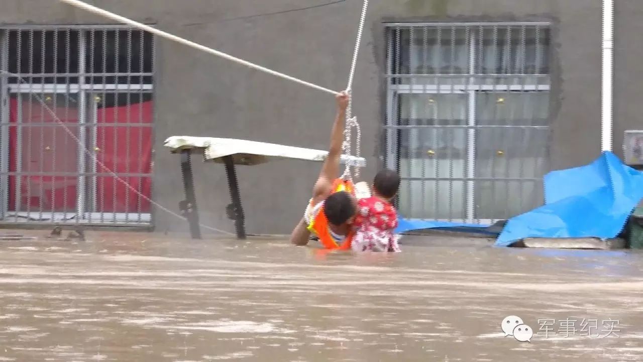 ▲大悟中队队长刘晓鹏第一个下到齐胸的洪水中,徒手爬上2楼,并多次往返进行救援。第二次回到居民楼的时候,他要营救一个三岁的幼童,但是这个幼童一直在啼哭不已,在渡过绳索的时候,刘晓鹏为了安抚他,不让他碰到水产生更大的恐惧,所以将他高高举过了头顶,让他觉得离水很远,更加安全。
