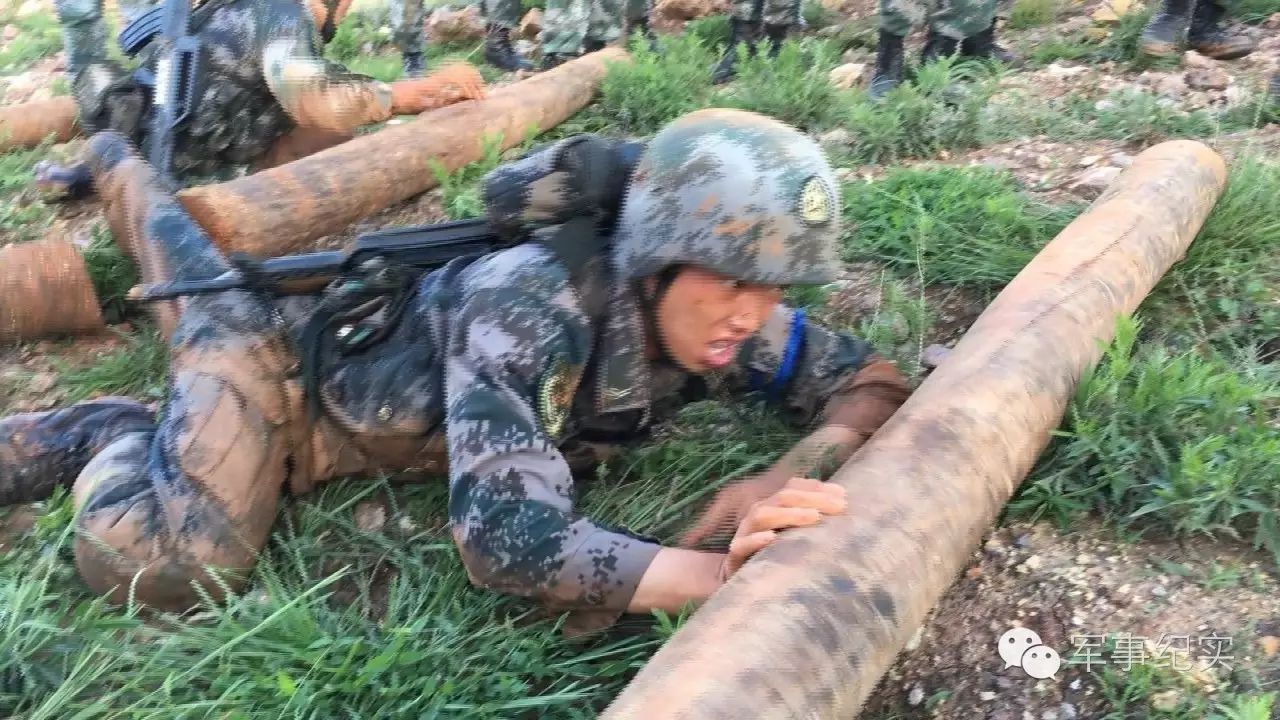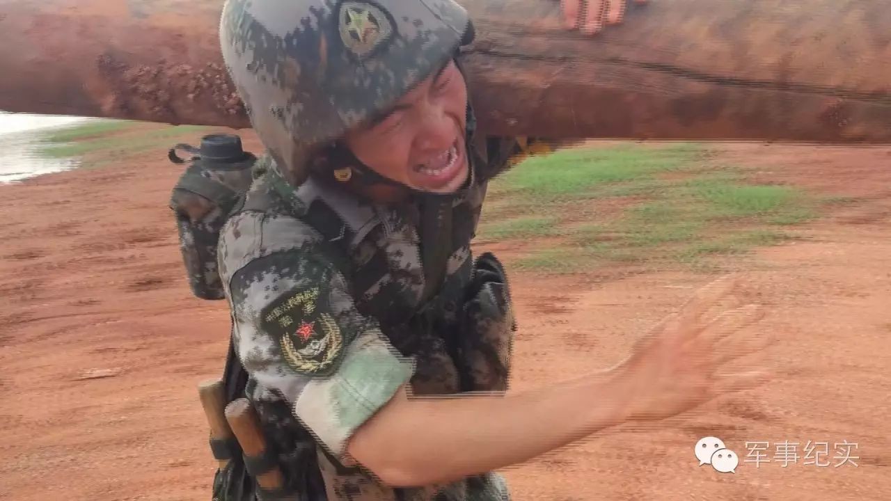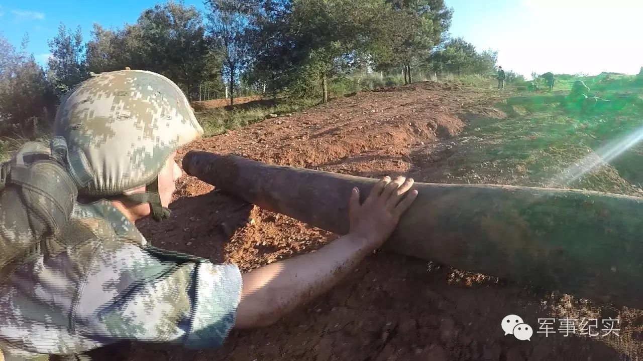 五公里武装越野后,紧接着的就是抗弹药箱和圆木行进500米,并低姿匍匐推圆木至山坡插有四面红旗的终点位置。这是他们的最后一搏,每个人都咬紧牙关向着终点冲刺!