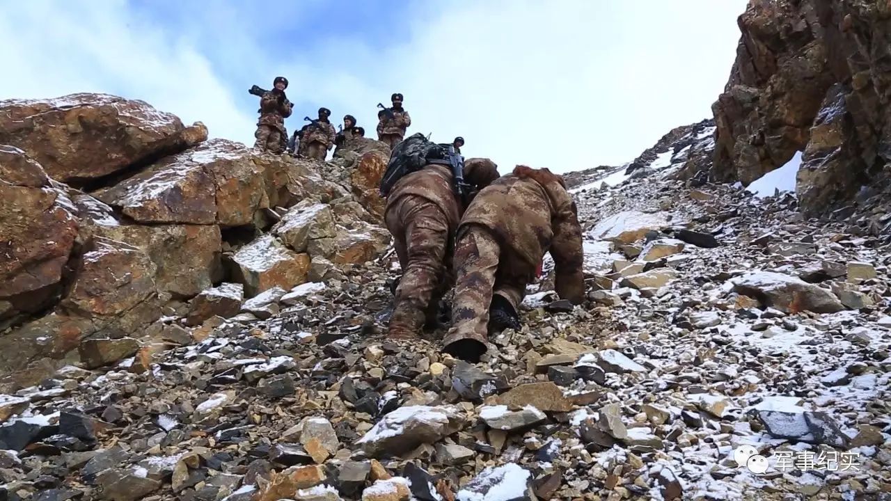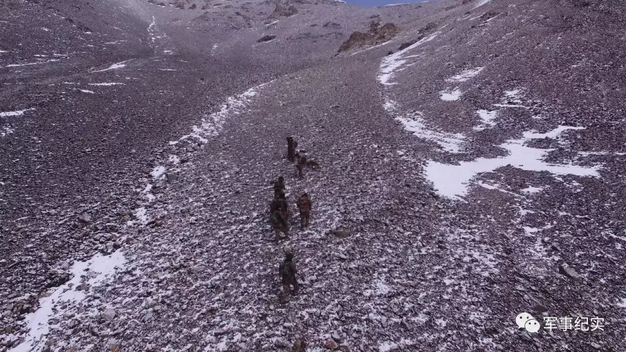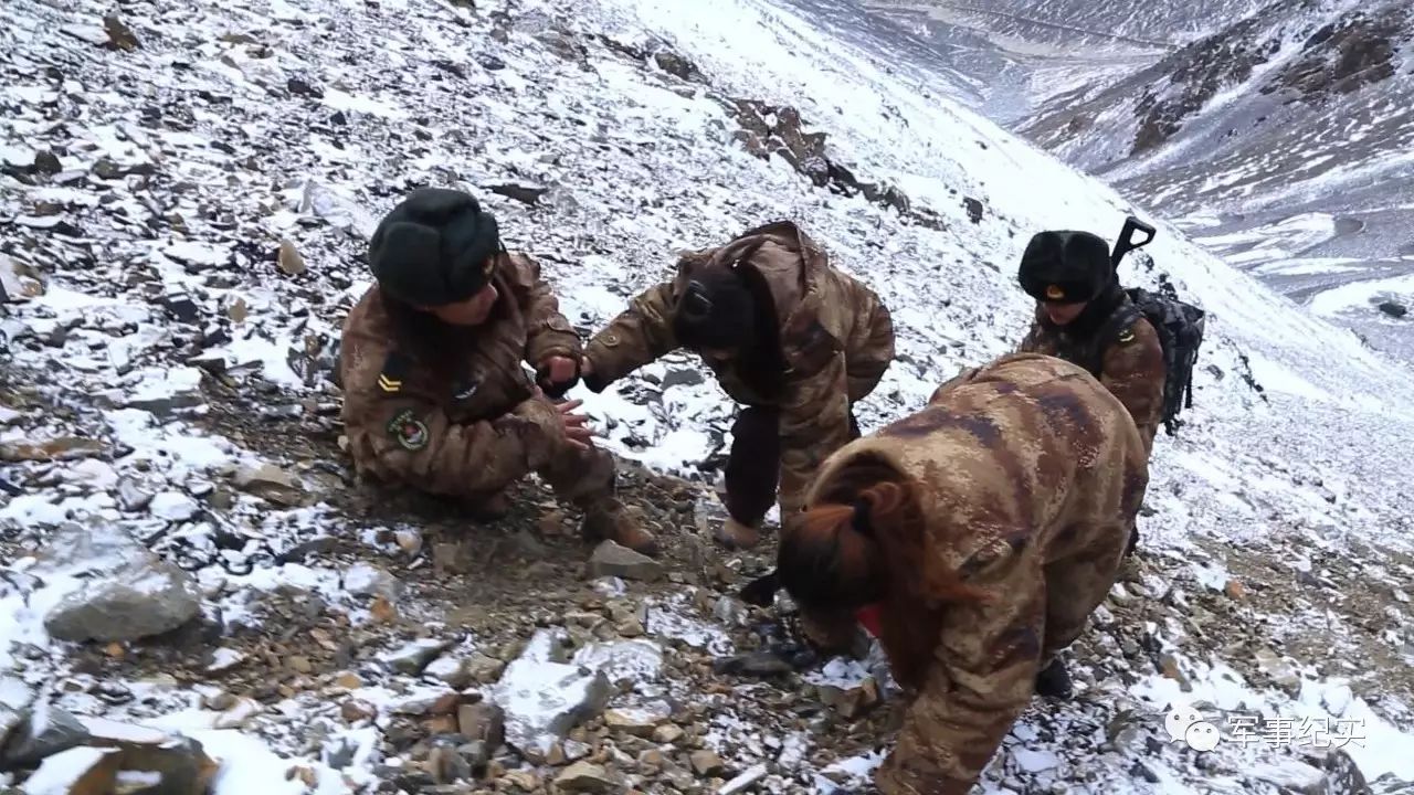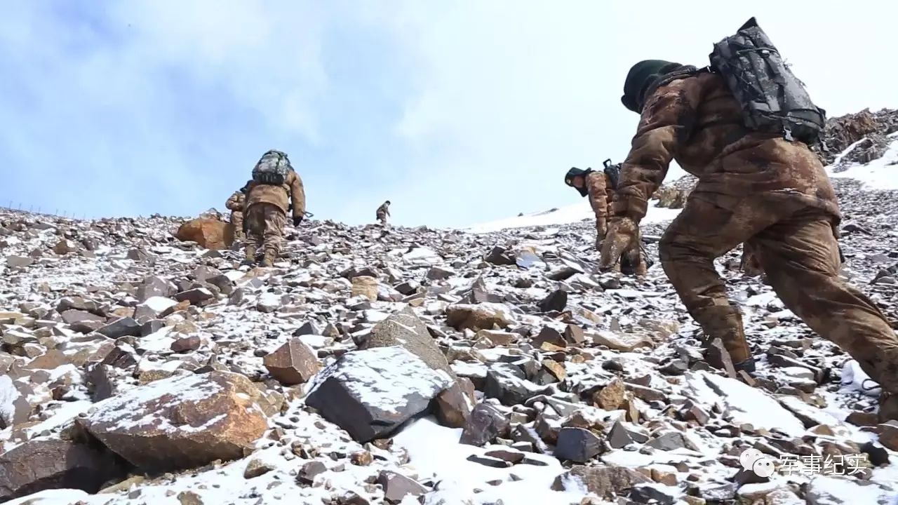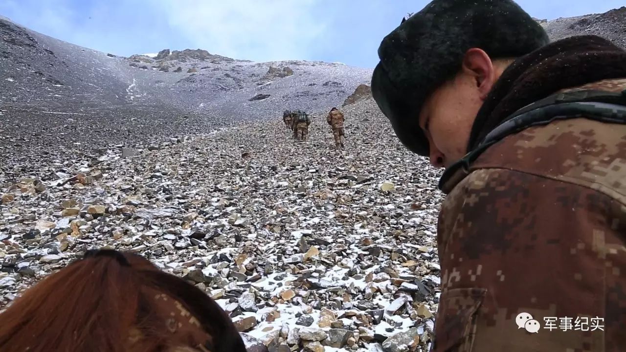 中阿边境的五号界碑,巡逻车只能开一段路。从距离界碑直线距离最近的地方往上爬,张德琴也要跟官兵们一样,经过垂直落差将近500米的土石山。这条山路不仅海拔高,并且山体的坡度接近70度,脚下全是碎石,走一步滑一步。
