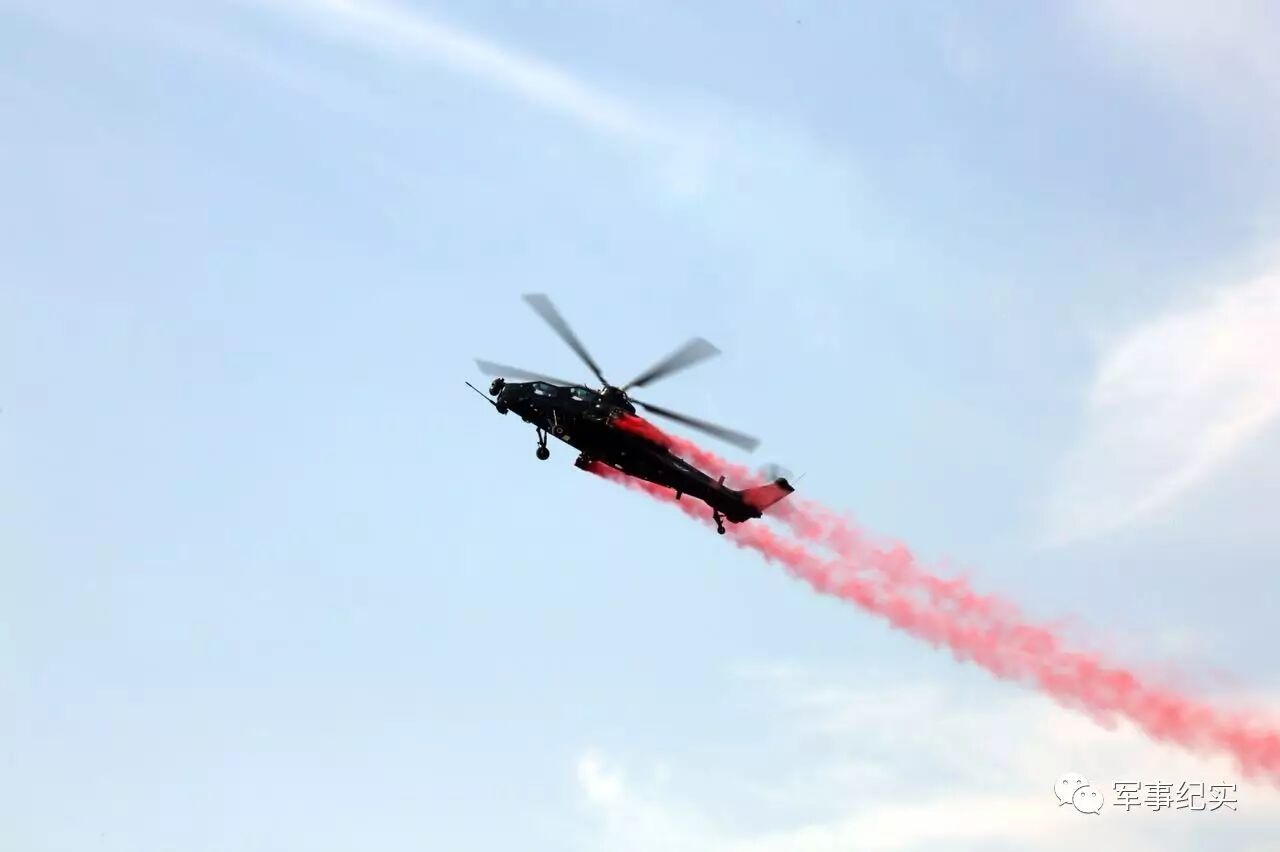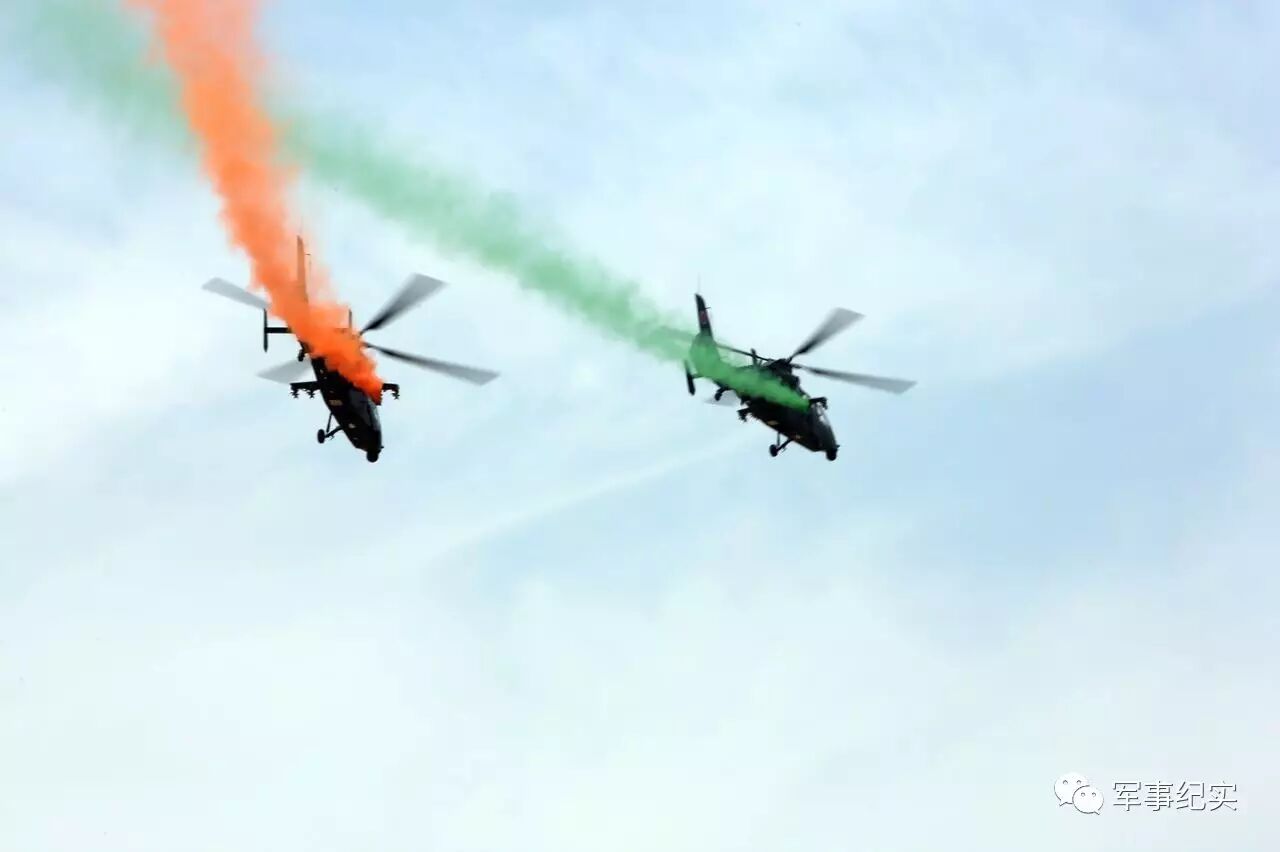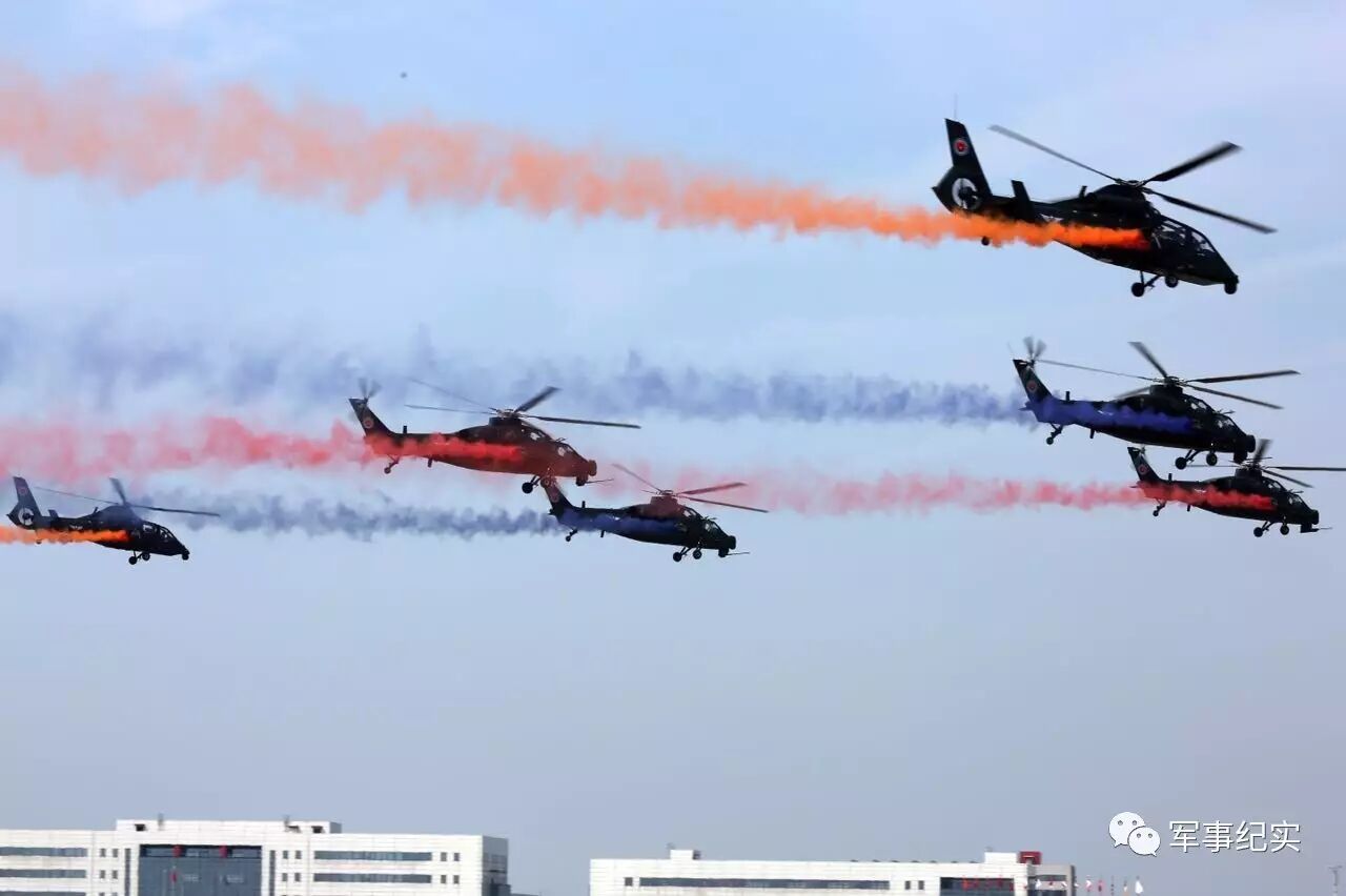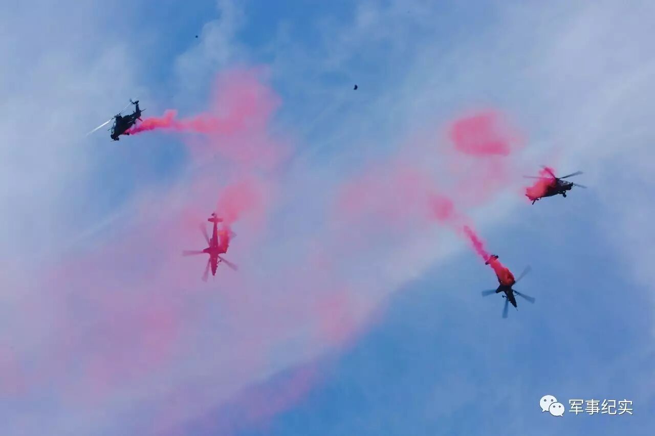 直-10武装直升机在空中舞蹈,彩色烟雾绚丽划过,惊艳了所有人的眼球。