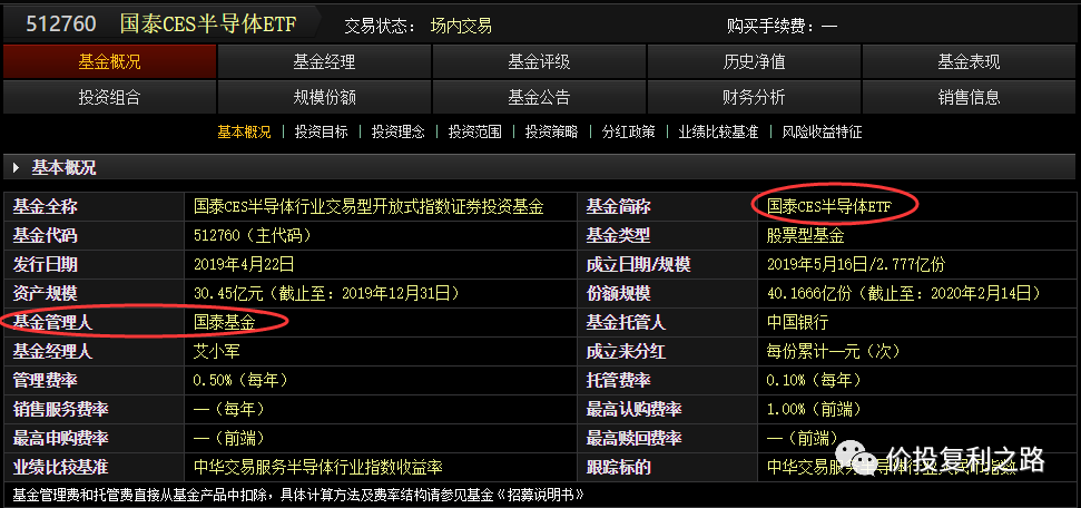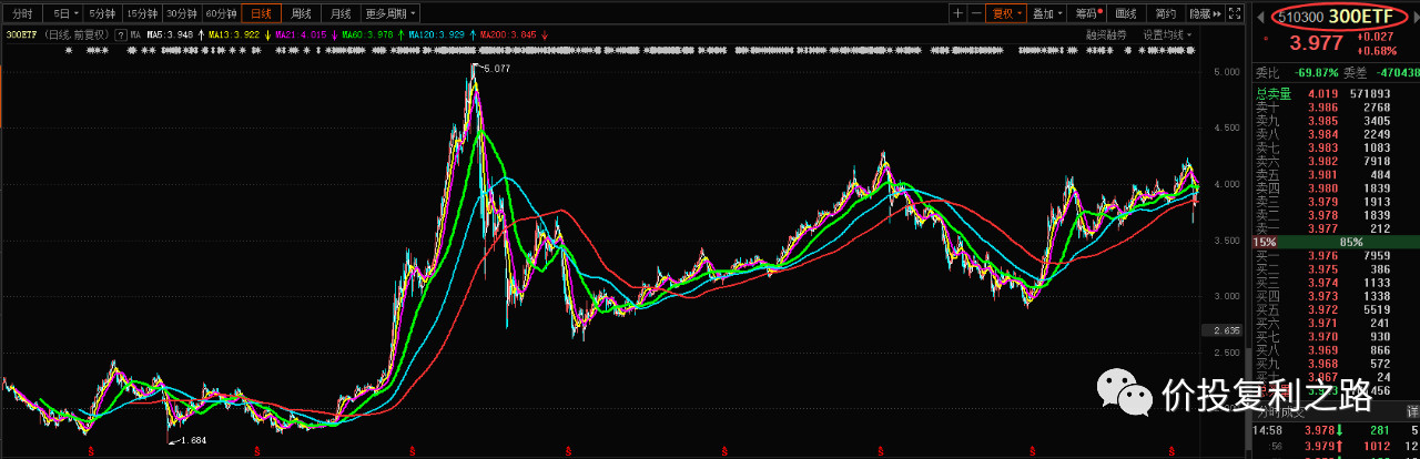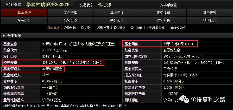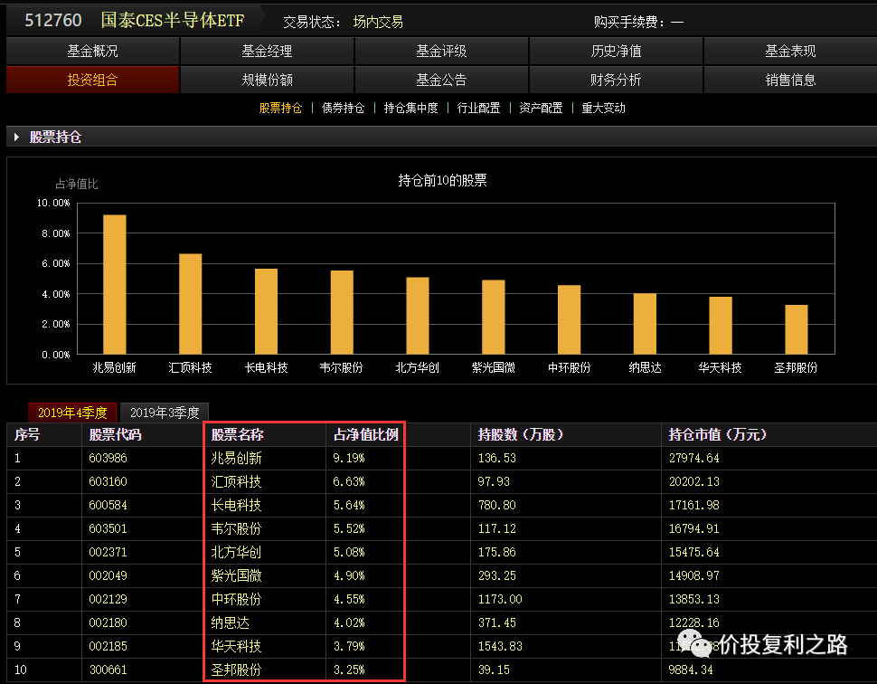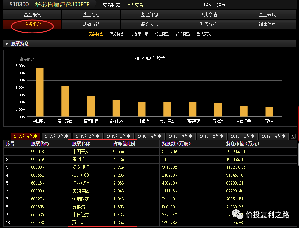 上面的图就是沪深300ETF的基本情况,可以在软件上看到这是华泰柏瑞基金管理的一只,并且可以直观看到该基金的前十大重仓股。我们可以通过重仓持股判断后市基金的表现,也可以通过可能有发行更多的行业基金,来猜测判断该板块内的个股会得到资金的后续介入。所以基金的走势会影响个股,个股的涨跌也同样会影响ETF基金的走势波动。