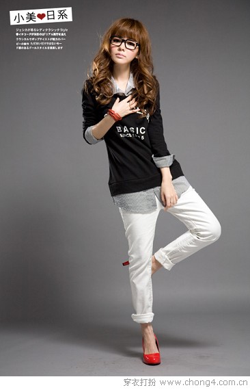 03 利用条纹衬衫与针织棉衫拼接设计,展现出两件式穿搭的效果,让你出门也不用再担心如何搭配才好。