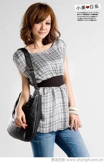 02 复古款式的格纹雪纺上衣,搭配一条牛仔裤,学院气质马上凸显,宽肩的设计让你的知性美十足,修腰的处理也是一大特色,令你备受注目。