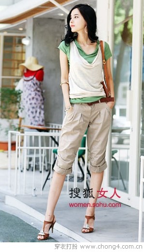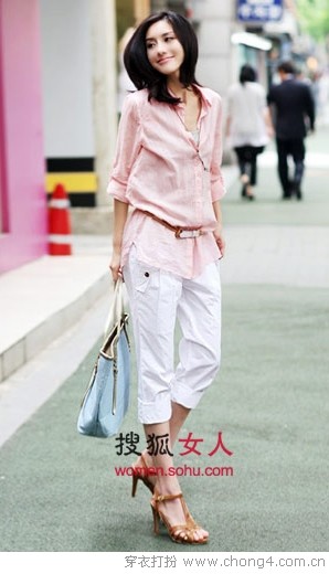 04 充满知性气质的温婉衬衫,搭配休闲七分裤,别忘了搭配一款超百搭镶钻小皮带哦,更显时尚可爱。