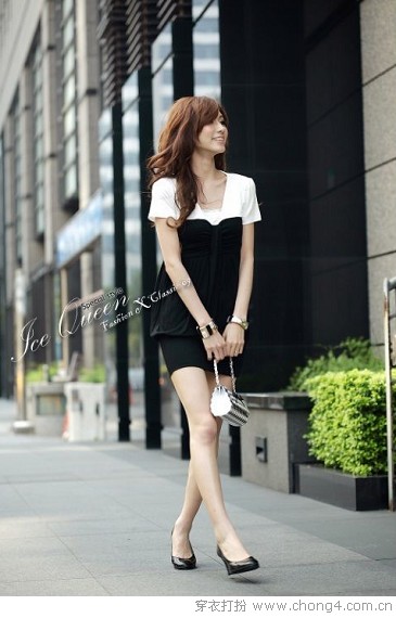 稍显休闲的黑色连衣裙,裙尾的褶皱设计让裙子的感觉丰富起来,腰间绑上一条白色的蝴蝶结缎带就能轻松创造出时尚的黑白魅力,白色的高跟鞋在颜色上增加白色在整体造型中的百分比,让颜色的配合更加和谐!