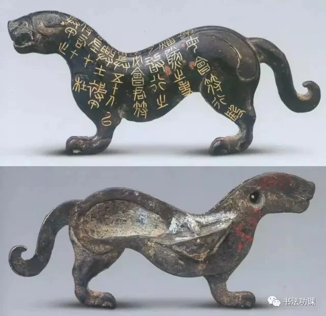 虎符上有错金铭文9行40字:“兵甲之符。右才(在)君,左在杜。凡兴士被甲,用兵五十人以上,必会君符,乃敢行之。燔燧之事,虽母(毋)会符,行殴(也)。”虎符“右在君,左在杜”,意思是说右半符存君王之处,左半符在杜地的军事长官手中,凡要调动军队五十人以上,杜地的左符就要与君王的右符会合,才能行军令。但遇有紧急情况,可以点燃烽火,不必会君王的右符。器物铭文是在虎身镂刻阴文,再将金丝嵌入阴文之内,最后镂平打磨光亮,虽历经两千多年,仍熠熠闪光。字体绝大部分是小篆,规整挺秀。
