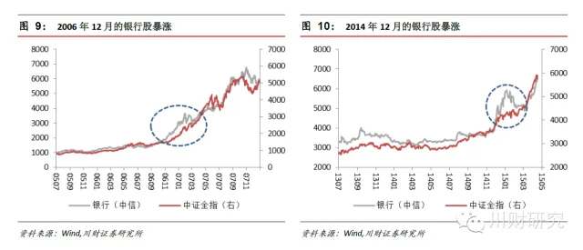 五:2006年12月和2014年12月类似发生过银行股暴涨领先其他A股的二八分化现象,值得启发的信号是第二次二八分化最严重的2007年10月是当时一轮牛市的顶点。