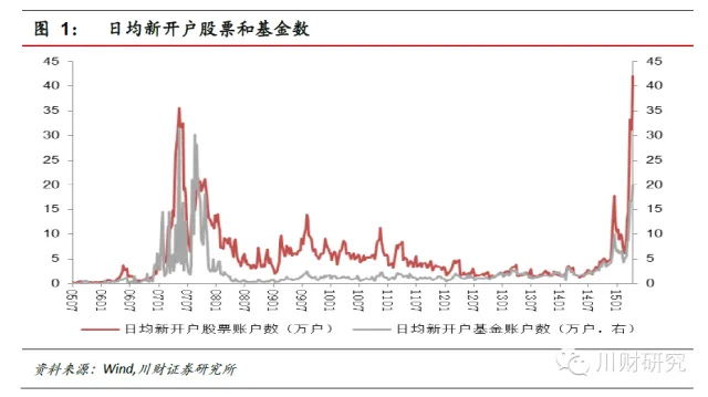 一:投资者开户情绪高涨,与2007年发生的情况类似。值得启发的信号是股票开户数早于基金开户数见顶,同时也早于大盘见顶。