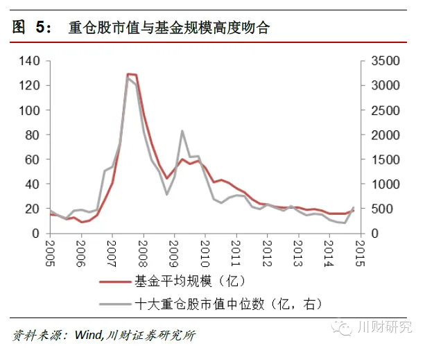 二:新基金规模不断膨胀,与2007年发生的情况类似。值得启发的信号是基金投资的重仓股市值与基金规模高度吻合,因此关注基金规模的变化预示风格的切换的背后逻辑。