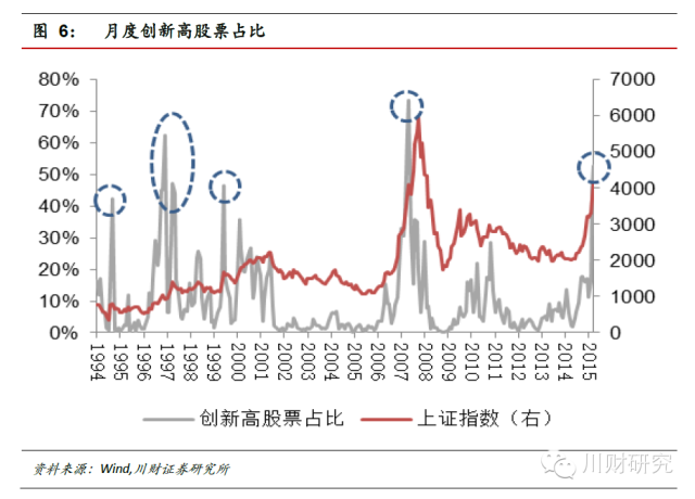 三:2015年4月有54%的股票创历史新高,上一次超过40%以上是在2007年3月到5月。值得启发的信号是每次超过40%的股票创新高以后的回调都是剧烈的,但是绝大多数都不是一轮牛市的顶部。