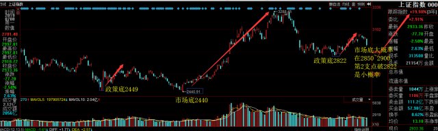 2、政策底和市场底,通常不是一个点位,但点位差距应不会太大,市场底比政策底略高或略低。如最近的一次,政策底产生于2018年10月19日2449(降准驱动),市场底在2019年1月4日2440,略破了政策底9点,差距不大。所以,2822以来的第2支点,应略高于2822,或略低于2822。