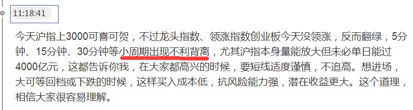 上图是今天上午11点18分我的发言。从这个发言可看出,创业板今天逆沪指上涨而下跌,是5、15、30分钟等小周期出现不利背离引发,而更大周期的不利背离并未产生。同时,阴包阳是创业板盘中的现象,收盘创业板有拉起,K线组合不能算阴包阳。这样,创业板调整性质应该是短调,是上涨到2800中线保守目标前的休整。我们让牛儿跑,又不让牛儿休息和吃草、低头喝水,那是不行的。故今天沪指拿下3000、创业板却下跌,算沪指随时会短调的预警信号,却不是整个市场的危险信号。