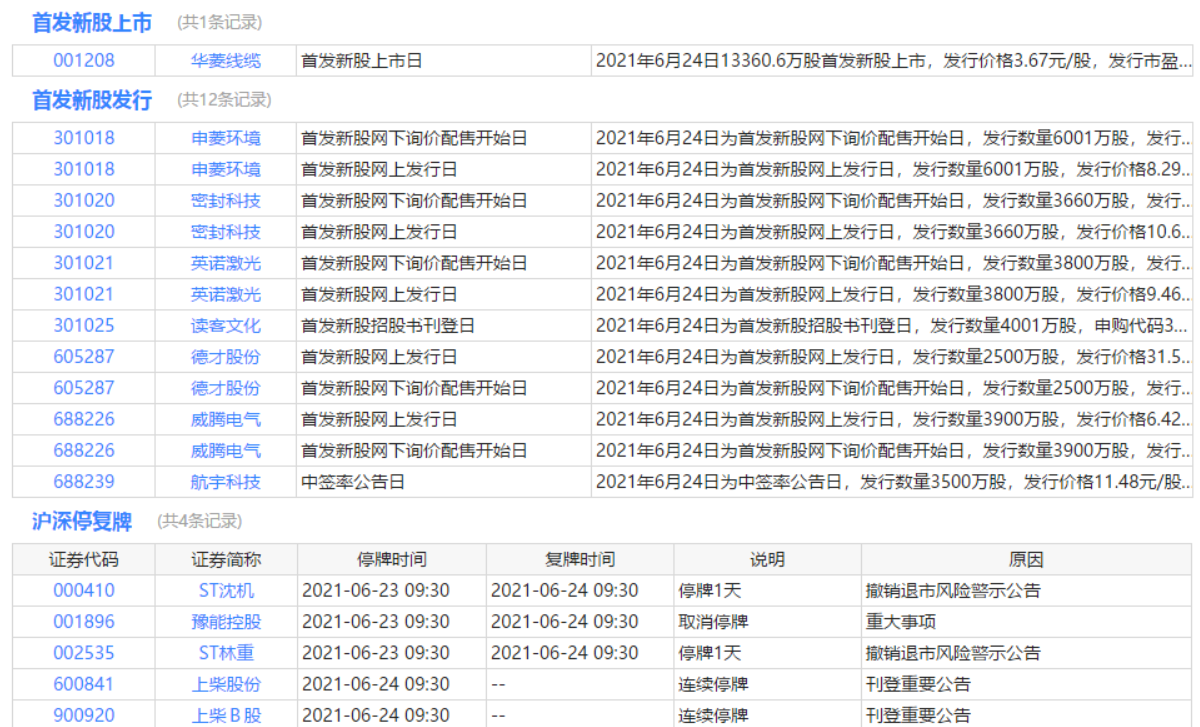 今日上市、申购、停复牌、特别处理、限售解禁等提醒: