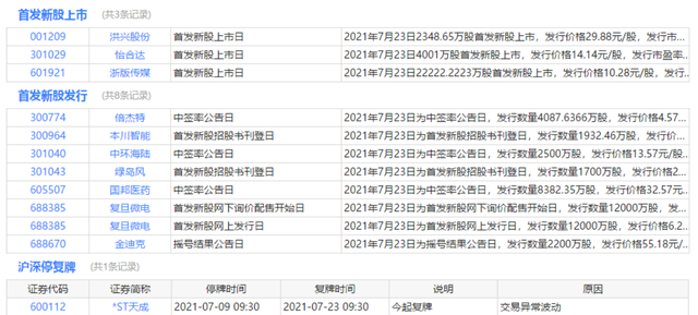 今日上市、申购、停复牌、退市、限售解禁等提醒: