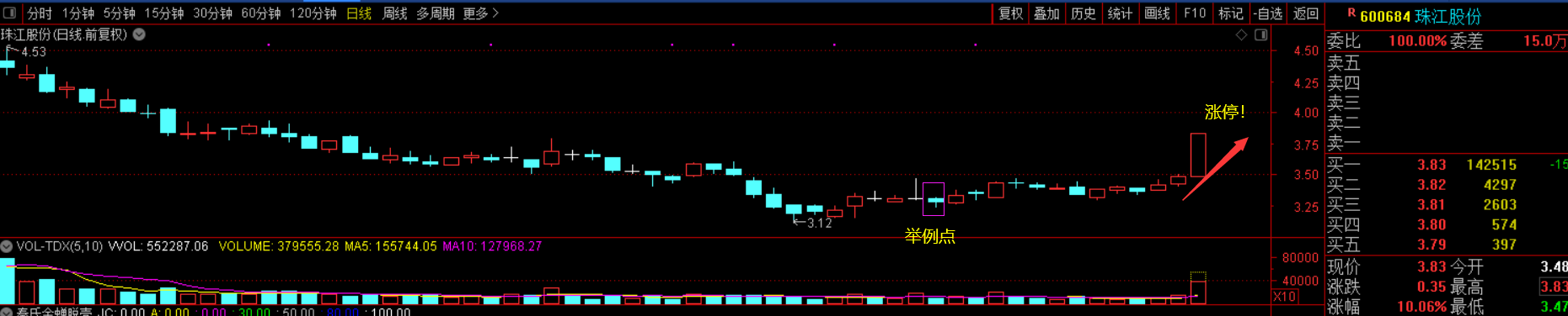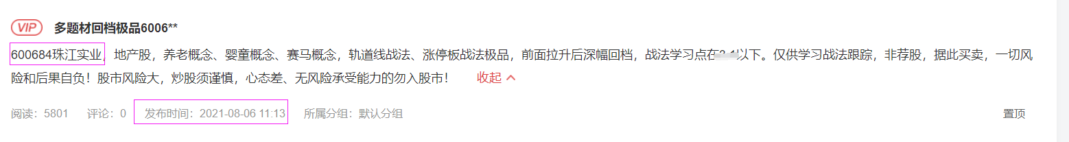 喜报:600684珠江实业,8月6日VIP举例学习,当天是近期最低区间,随后偷偷上涨,今天上午已加速,目前已怒封涨停。我爱涨停板,我爱底部进场!下面是8月6日举例截图和K线,好好领会!