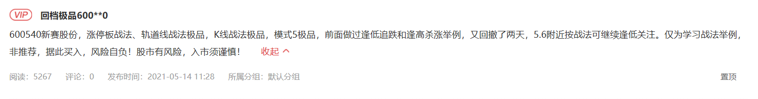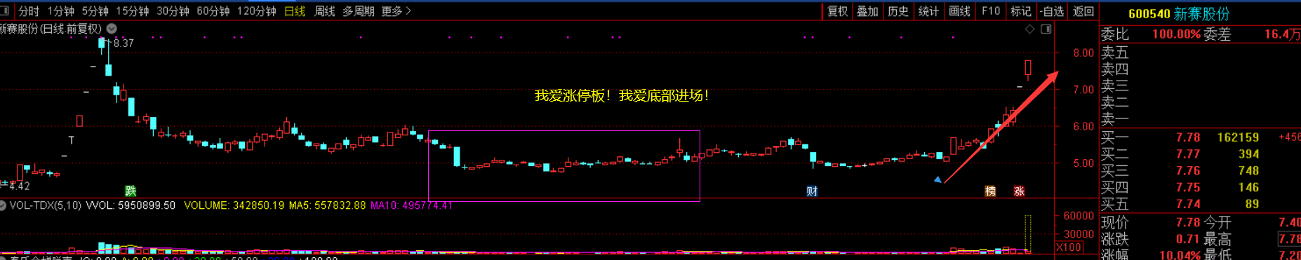 喜报:600540新赛股份,5月14日VIP举例,蛰伏很久,适合埋伏了就去避暑旅游,近期开始爆发,9月两度涨停,上周五和今天连续涨停。我爱涨停,我爱底部进场!我爱进可攻、退可守极品!以下是举例截图和K线,大家好好体会、感悟!