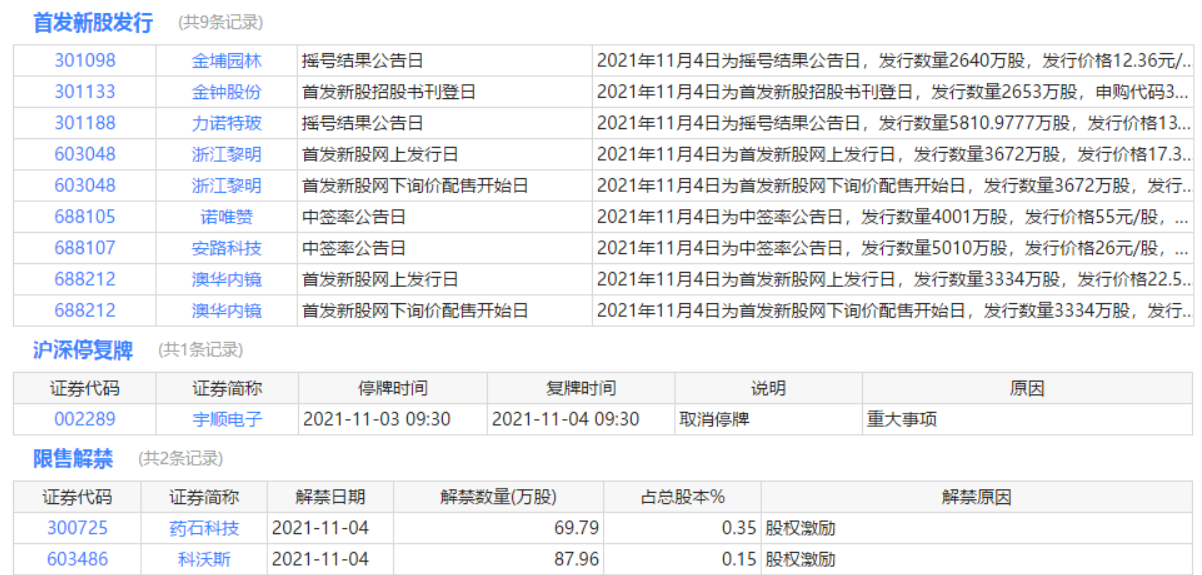 今日申购、停复牌、限售解禁等提醒:
