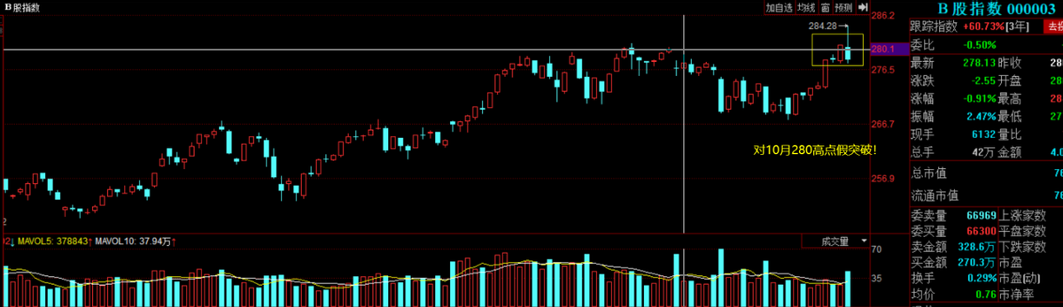 上图是B股指数走势图,可发现,和沪指相比,B股前面更强,近两周震荡上攻,昨日尤其今日再创今年新高284点,下午却风云突变大跳水,收盘只有278,对10月280高点形成假突破。B股一贯被视为A股风向标之一,B股假突破跳水,A股会步其后尘假突破跳水么?