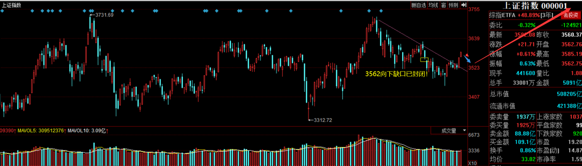 上图是沪指走势图,今天沪指开盘3562,基本是全日最低,开盘就补完了我们上周盯了一周、一直未封闭的10月3562向下缺口,在上周五下午翻越紫线(9月3723以来下降压力线)后,今天轻松站上3530附近的紫线。紫线是下移的,明天大体在3520附近,比今日3530更低。沪指今日收盘3582,只要明天不大跌52点以上,即使指数下跌,也会很轻松站上紫线。