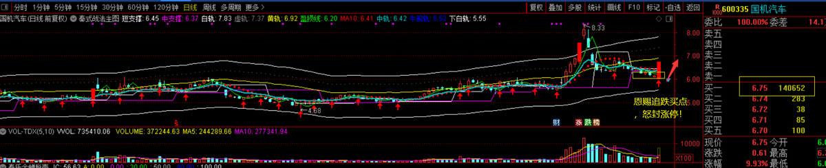 喜报:VIP极品600335国机汽车,11月18日举例,达到6.4以下越低越好的追跌学习点后,今天借欧美股市大跌,恩赐追跌点,低开后拉涨,怒封涨停。好好体会,我爱涨停板,我爱追跌进场!
