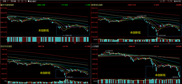 技术上,沪指、沪深300、上证50等都再创今年新低,跌破政策底,现在在寻找市场底。目前A50指数还有恒指、恒生科技指数等未再创今年新低,它们再创今年新低,应会成为大A彻底找到市场底的标志。