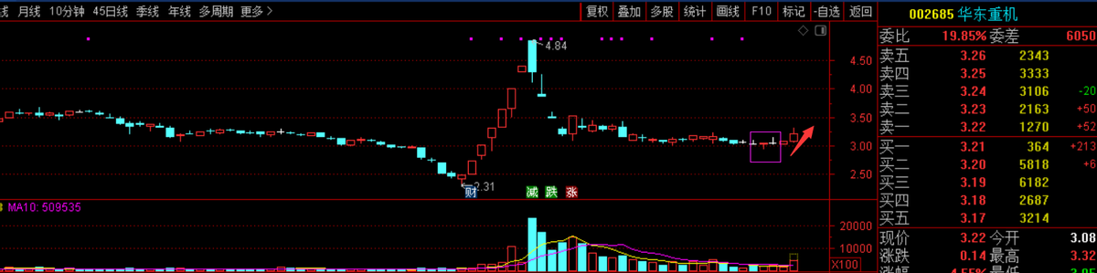 我在云掌财经6月6日举例的002**5即002685华东重机,本周二破3元,达到绝佳追跌点后,温和上攻,今天最高涨近8%。好好体会极品超跌股的逢低捕捉之道!