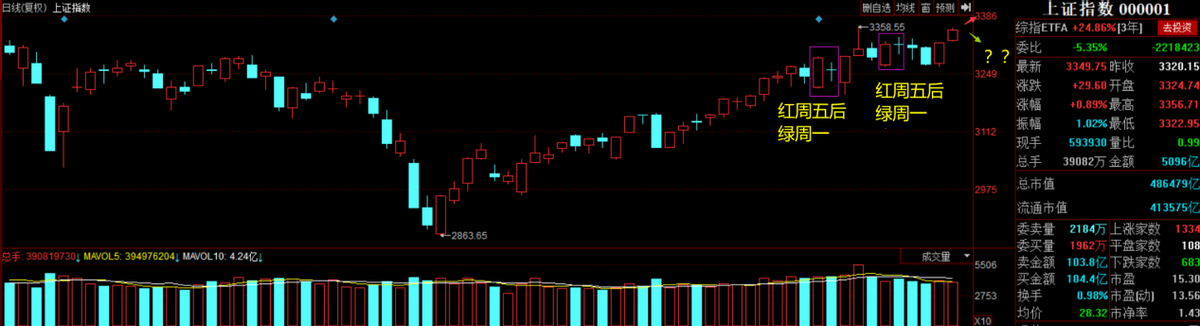 我认为,下周一出现绿周一概率挺大,一个就是前两周都是红周五和绿周一,相当于制造了学习榜样和惯例,一个是今天沪指红周五缩量、留下了开盘不利缺口。故下周一复制前两周的周一,出现绿周一是大概率事件,出现红周一是小概率。