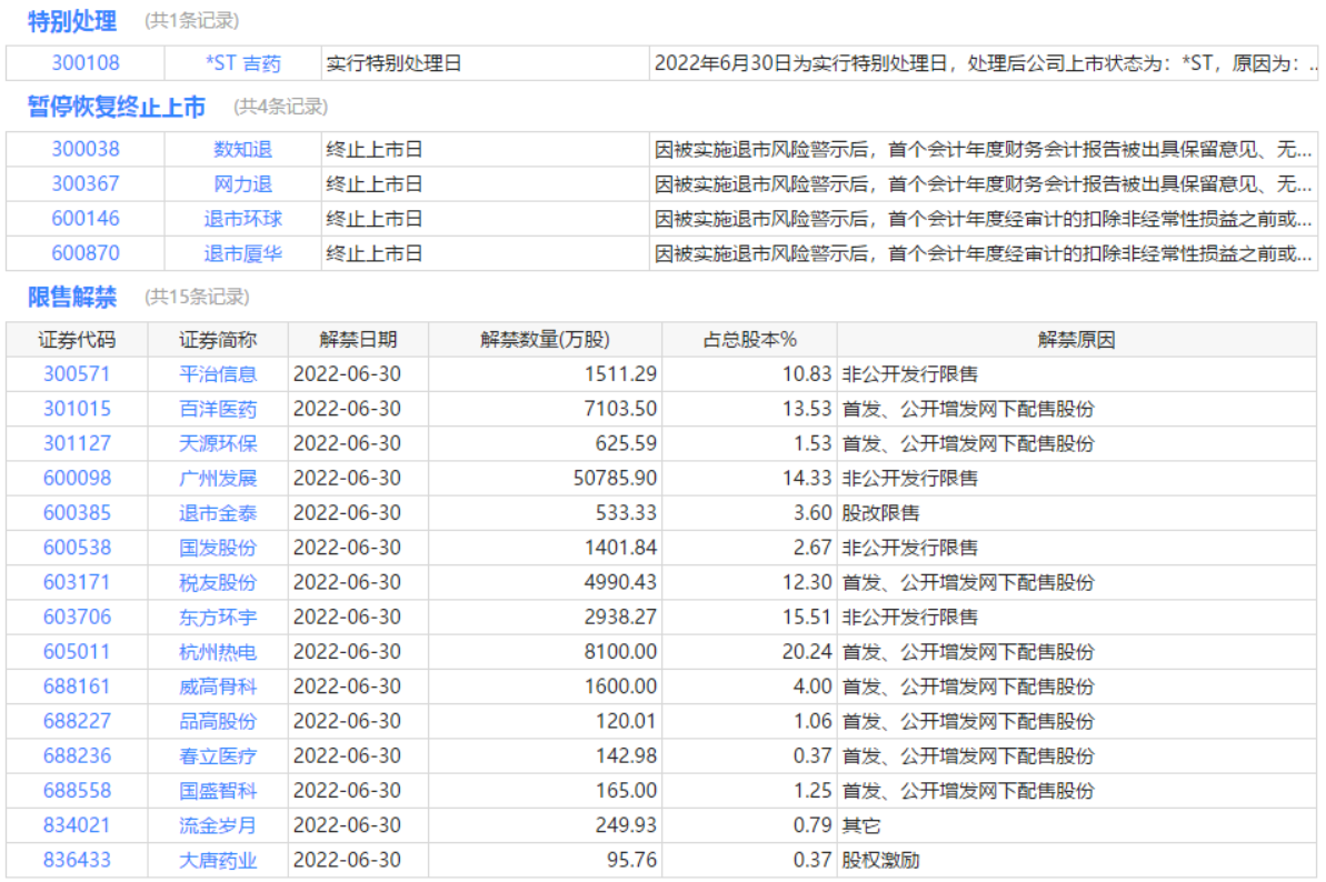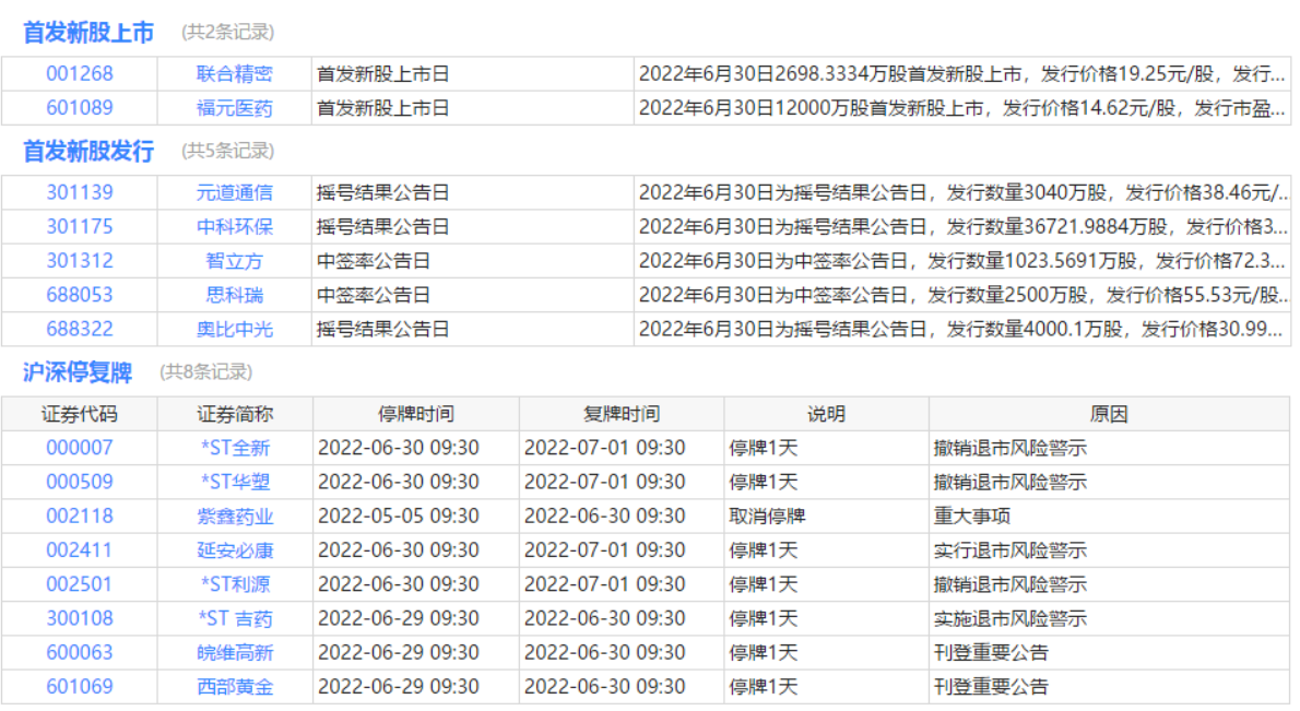 今日上市、中签、停复牌、特别处理、退市、限售解禁等提醒: