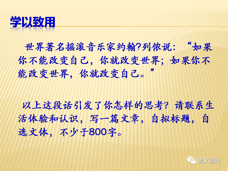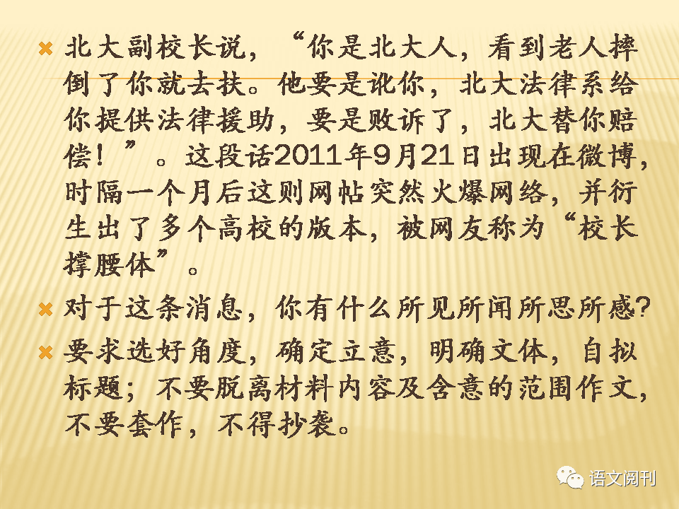 点评:将作文材料提供的三则语录,加以简单记叙和描写,引出材料和话题。