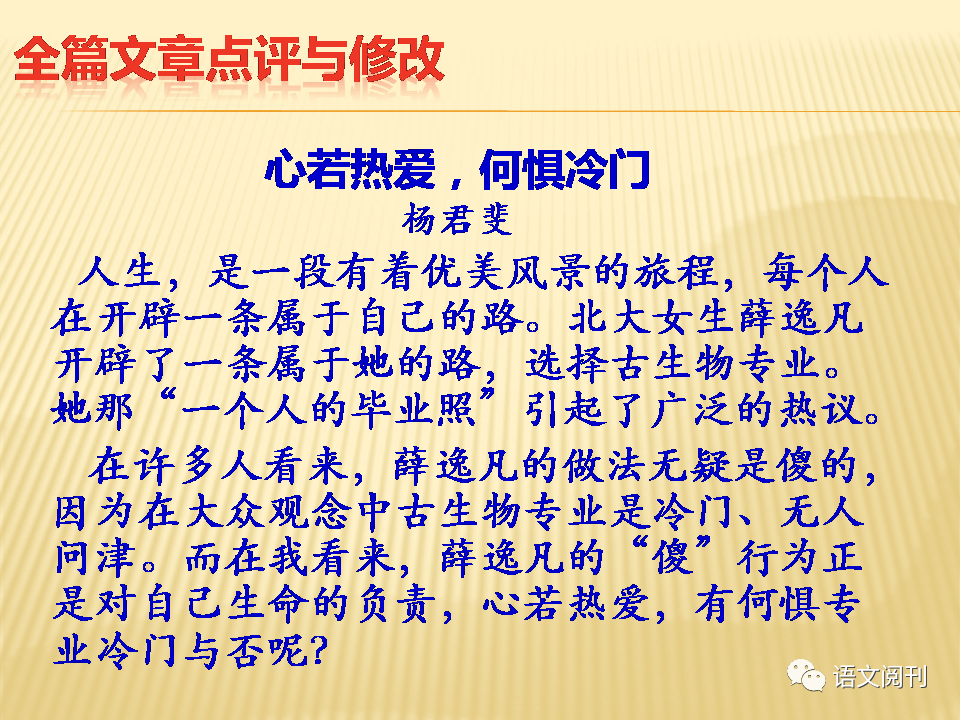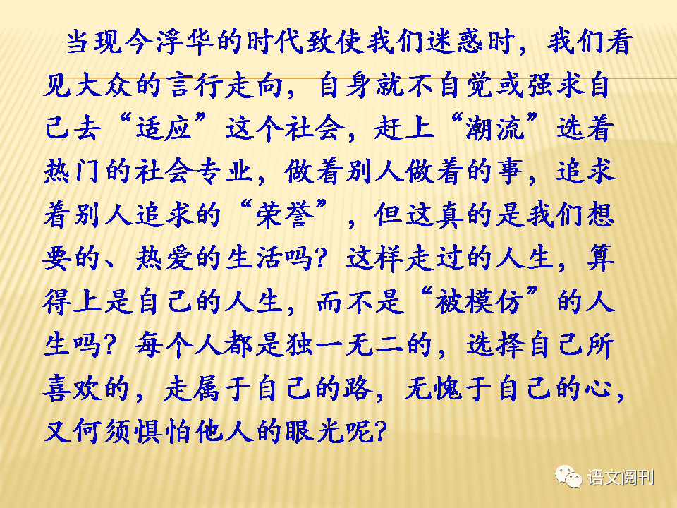 例如:这是一个喧嚣的时代,也是一个盲从的时代。一夫呼而众者应,只有缩在墙角的少数人默默坚守着真相、真理。当沃德力扫众议,坚持应该修补弹痕少的地方时,是否也曾受尽质疑与嘲讽?