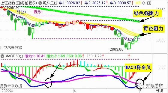 大盘反弹受阻乾坤三线之60分钟绿线。或乾坤三线之日黄色线。如明不能突破,短期有调整的可能。