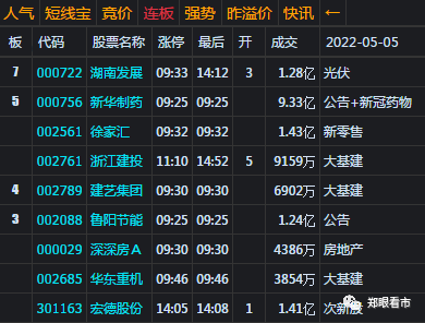 市场:农业及相关板块走强。医药及相关板块走强。此外,军工、次新、房地产、基建等多个板块盘中活跃。券商板块全天低迷。总体上个股涨多跌少,两市超3400只个股上涨,超170股涨停或涨超10%。