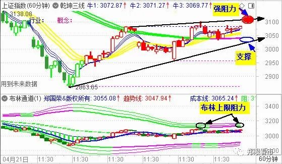 下周大盘关注乾坤三线之紫线处的支撑。阻力关注60分钟布林通道上限。