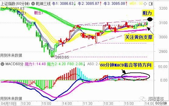 大盘60分钟MACD不断出现金叉死叉。而二线基本是粘合在一起,等待突破方向。由于大盘最后一小时K线基本是阴包阳,走势不太妙。