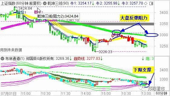 大盘反弹受阻乾坤三线之60分钟绿线,大盘调整再度获得60分钟布林通道下限的支撑。