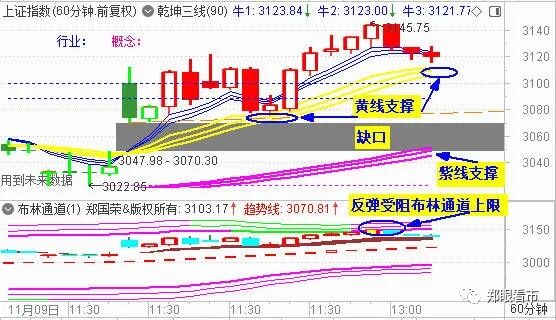 今大盘上攻至60分钟布林通道上限,再度受阻后出现回调。在乾坤三线60分钟黄线处获支撑。明大盘将再考验3110点处,乾坤三线60分钟黄线的支撑。预期最终跌破的概率较大。大盘调整一旦跌破乾坤三线60分钟黄线,支撑看破乾坤三线60分钟紫线。
