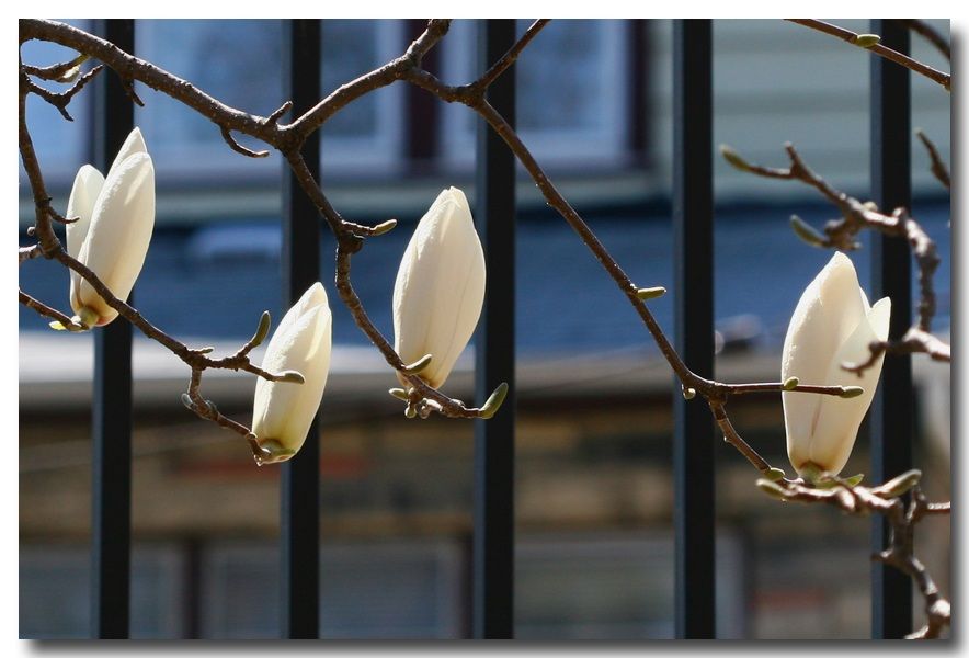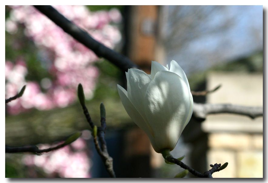 尤其是清华图书馆前那几株娉婷玉立,疏落有致地开着的白玉兰。那冰清玉洁的典雅风韵,与美国玉兰的风格迥异。终于在皇后植物园找到了一株颇为神似北京玉兰的白玉兰树,一种久违了的欣喜涌上心头。