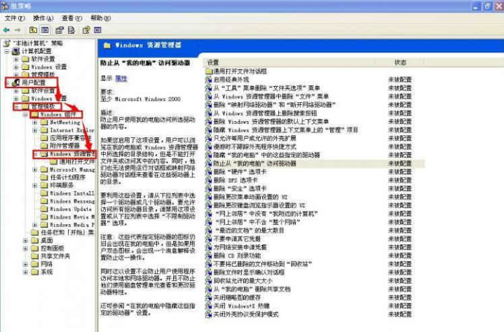 3、这时我们会发现,在整个窗口的右边窗口中,出现了一些选项供我们选择,那么接下来我们在右边的设置窗口中,选择“防止从‘我的电脑’访问驱动器”项,并在这个选项上单击鼠标右键,选择“属性”,接着出现“防止从‘我的电脑’访问驱动器的属性”设置窗口,在其中有三个选项,分别是“未配置”“已启用”“已禁用”,我们系统默认的为“未配置”选项,接下来我们要对这个对话框中的参数进行设置了。