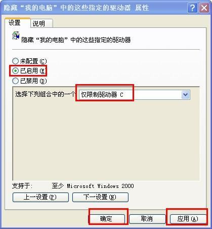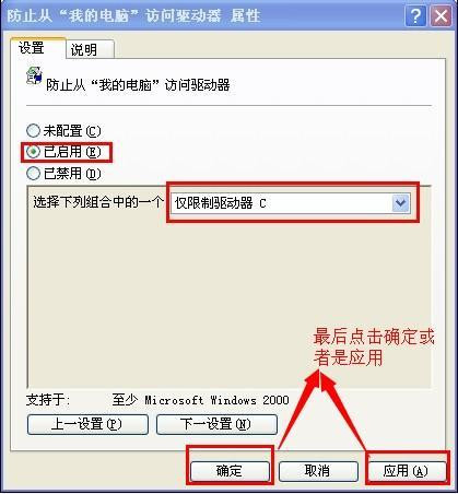4、选择“已启用”后可以看到,在下面就会出现选择驱动器的下拉列表,如果希望限制某个驱动器的使用,只要选中该驱动器就可以了。比如我们要限制C盘的使用,选中“仅限制驱动器C”,就可以了。如果希望关闭所有驱动器,可以选择“限制所有驱动器”。选择好要限制别人访问的驱动器,最后点确定或应用按钮即完成了整个设置过程。设置完成后,让我们试试看是不是我们设置的驱动器受到了限制。打开设置受限的驱动器,系统自动弹出禁止使用打开驱动器的提示框。由此看出,我们的设置生效了。即便是使用DIR命令、运行对话框和网络驱动器对话框,也无法查看此驱动器的目录和数据。