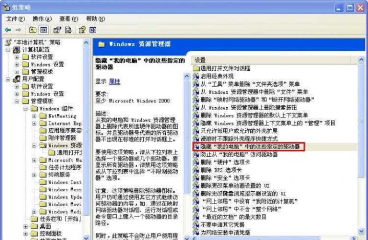 3、在“WINDOWS资源管理器”右边的设置窗口中,选择“隐藏我的电脑中这些指定的驱动器”项同样在它属性中,有三项选择,我们选择“已启用”项,然后在下面的下拉列表中选择需要隐藏的相应驱动器。设置完成后,我们回到WIN桌面下,打开我的电脑,这时是不是会发现我们设置好的驱动器盘符不见,到这里,整个设置过程就完成了。