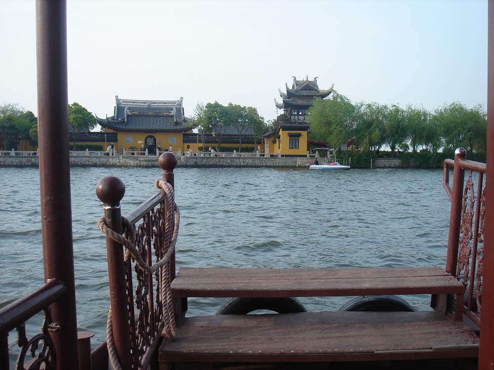 我们游到最后,忽然发现时间过的太快,将近4点了,要想到罗星州就得快点了,我们于是坐了一个三轮车,他以最快的速度把我们拉到码头,赶上了4点15分最后一班船。因为是通票,所以乘船是免费的。同里湖很大,电动船开得很快,划开碧波,向湖中的小岛-----罗星洲驶去。这班船上除了我们就只有一对年轻的夫妻,大约10分钟远远的看到了那个被湖水包围着的小岛。远远看到寺庙的黄色围墙和飞檐跷角的屋顶。