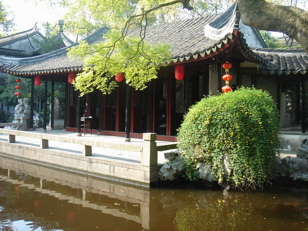 走月牙门,进曲廊往南是就是闹红一舸。退思园中,我最喜欢的就是最富动感的“闹红一舸”,这一石舸突兀池中,由湖石所托,有头无尾,半浸碧波之中,风吹不动,浪打不摇,可人站在船头,却有小舟荡湖之感,潺潺水声不绝于耳。舷侧水面,行云倒影浮动,恍若舟已启航,别有情趣。石舸之四周,原植有荷花及菰蒲,夏秋季节,清风徐徐,绿云摇摇。只可惜现为春季,荷是无法赏了。荷池中游鱼却多,它们似通人性,稍稍击掌。便成群结队而去,妙趣无比。