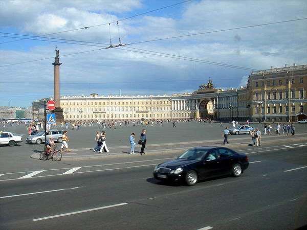 冬宫前面的冬宫广场是非常壮观的。我们去时因当晚有滚石乐队的演出,已经戒严,无法过去,我们只在车上拍下了广场的镜头。广场的北边是冬宫,南边则是一整排的俄罗斯古典主义建筑,最特别的是中央一个双拱廊通道设计,非常壮观,走廊顶气势磅礡的雕像描述胜利女神驾着战车奔驰的英姿,是广场焦点之一。中央47米高的亚历山大柱,是为了纪念沙皇亚历山大一世战胜拿破仑而立,花了将近4年的时间才顺利完成。许多历史事件都曾发生在胜利广场上,其中最重要的是列宁领导的波尔什维克党人就是从这里攻入冬宫而革命成功。可惜我们无法走近观看了。