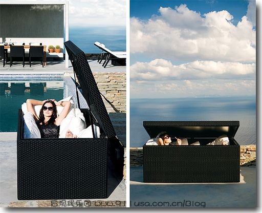 看到图中这位MM安逸地躺靠在一个巨大盒子里,我们不禁疑问这就是传说中的巨盒躺椅吗?貌似有点象巨人的鞋盒,这款防水的躺椅最有趣的地方是那采用液压固定的黑色盒盖,盒盖能有效吸收太阳光紫外线,起到遮阳伞的功能。