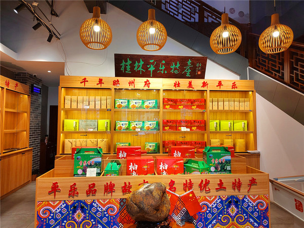 一楼大厅摆放着各种平乐特产,比如青龙香芋、平乐柚子、平乐盐菜、腐乳或者当地茶叶之类,可以让人不用出南宁,也可以买到平乐的特产。