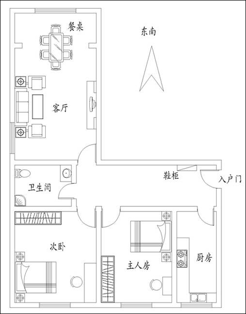 1.就所标注的方向来看,这个户型偏向应该在45度左右,这种偏向过大的格局,主要会对居住人在人生运势中造成反复性偏大,做事辛苦较重的信息。再者正南、东南两处为大的缺陷,这里有缺,不但对居住人的眼睛视力和心脏会产生不利病体,同时对肝胆和睡眠方面,也会带来不利影响,尤其是逢生肖马,蛇,猪,鼠的流年,对家人的影响偏大。